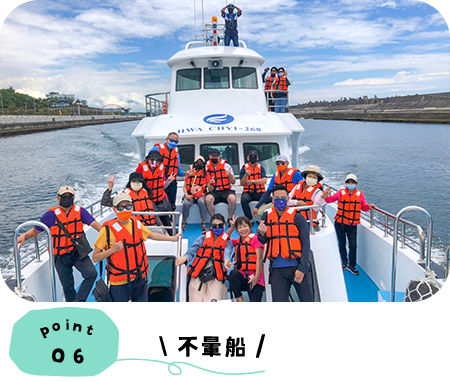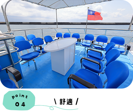 船頭遊艇式座位舒適+讓遊客更近親臨大海&鯨豚,獨家設計船頭12個VIP座位。
