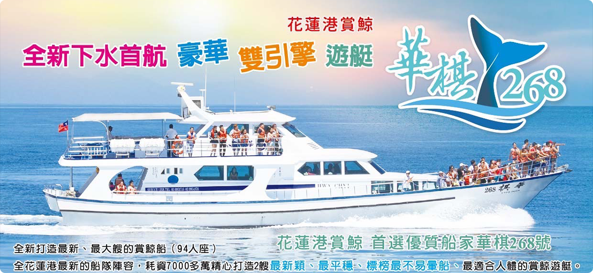 華棋268號我們是在宜蘭烏石港經營龜山島賞鯨船近20年的華棋號、蘭鯨號團隊,憑藉著多年來的賞鯨豚的經驗與熱愛。再次跨足花蓮港為遊客量身打造最舒適的賞鯨遊艇來為花蓮遊客們服務!